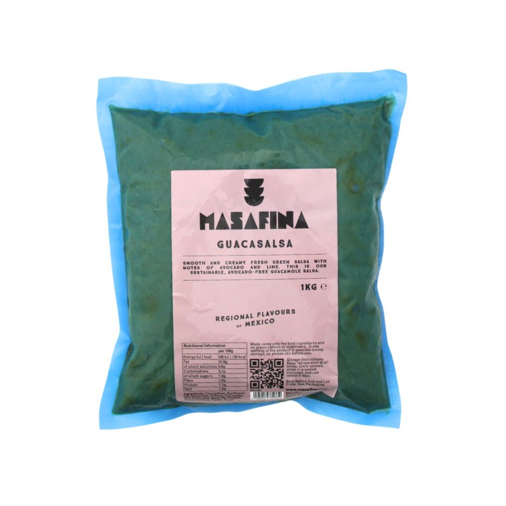 Smooth and fresh green salsa with notes of avocado and lime. A sustainable, avocado-free guacamole salsa made with creamy courgettes and tangy tomatillos.